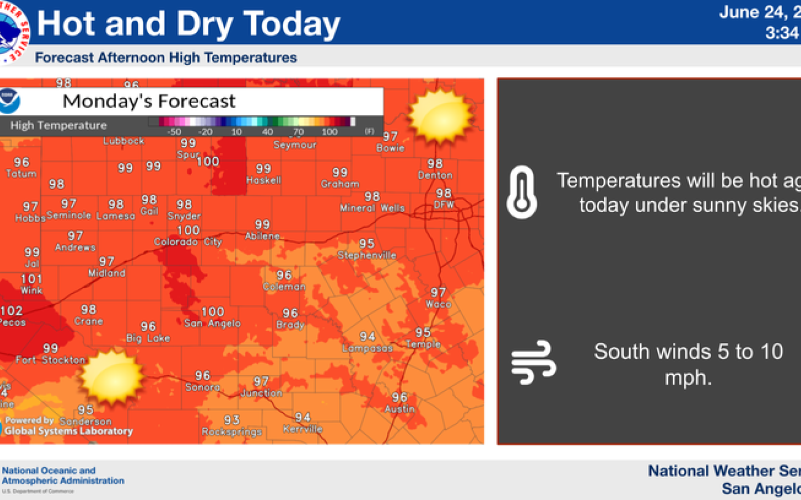 Monday is expected to be sunny and hot with a high near 100 degrees Fahrenheit. South-southeast winds will blow around 5 mph. Tonight will remain mostly clear, with a low around 77 degrees and south-southeast winds increasing to around 10 mph.