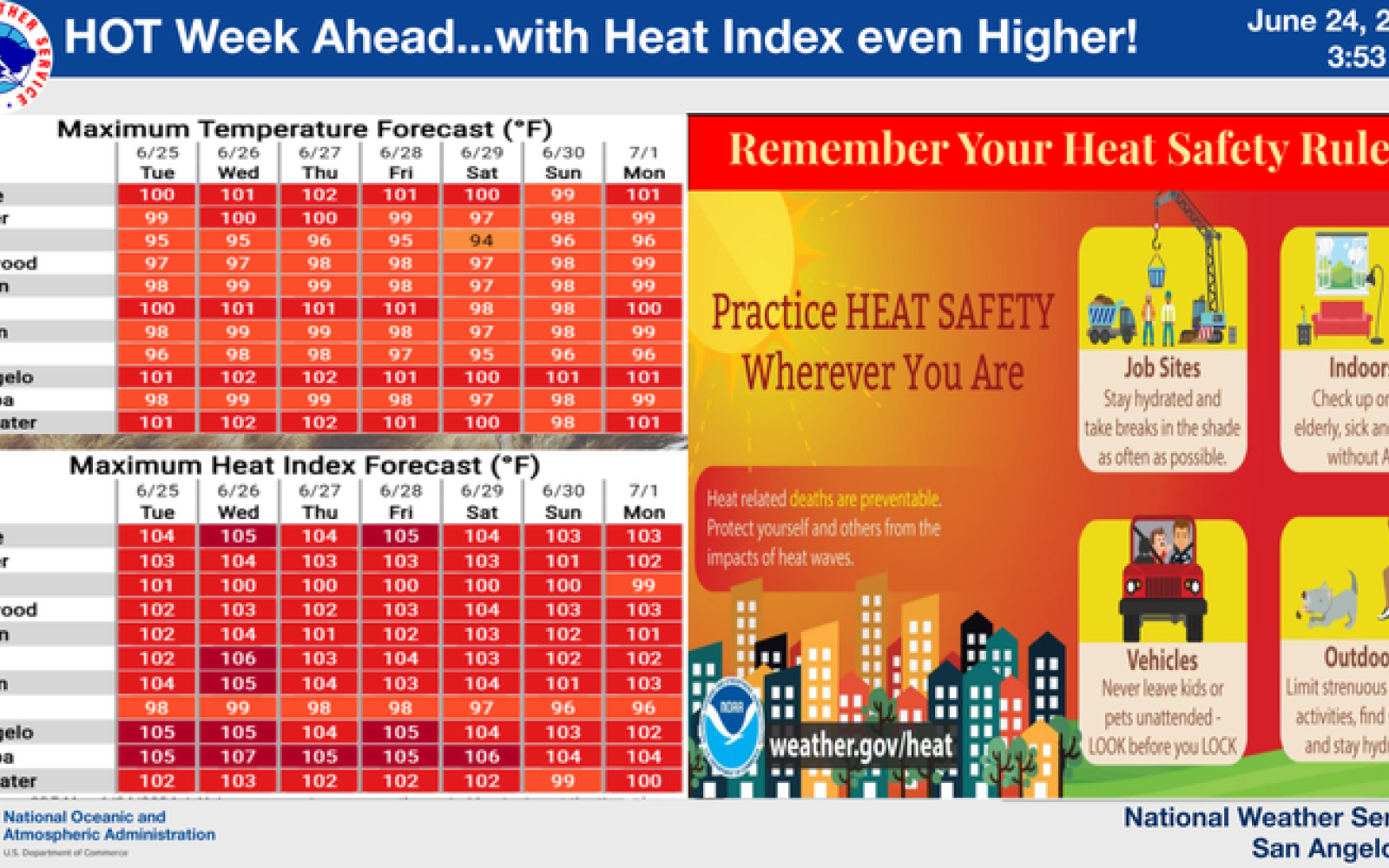 SAN ANGELO, TX — The National Weather Service has forecasted another scorching week for San Angelo and surrounding areas, with temperatures expected to reach triple digits through the weekend.