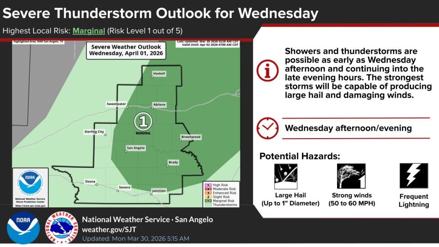 SAN ANGELO, TX — Showers and thunderstorms with a marginal risk of severe weather are possible Wednesday afternoon and evening across much of the San Angelo region, the National Weather Service said Monday.