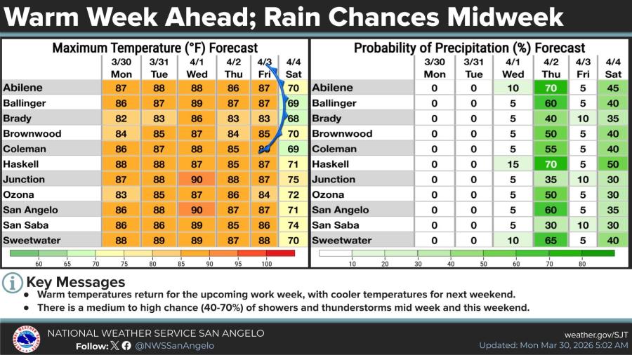 Warm temperatures will continue through Friday, with highs mostly in the 80s and low 90s. Rain chances increase midweek, with a 5% to 15% probability Wednesday and a 40% to 70% probability Thursday in many communities. Additional rain chances return this weekend.