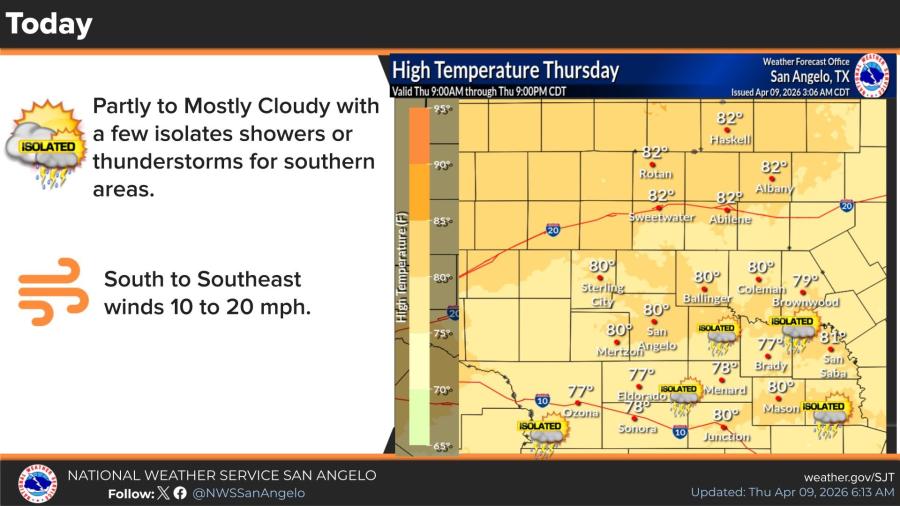 Today, Thursday, will be partly to mostly cloudy with a low (20%) chance of isolated showers or thunderstorms, mainly in southern areas. South to southeast winds will blow at 10 to 20 mph. High temperatures are expected in the upper 70s to low 80s.