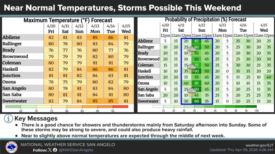On Sunday, severe thunderstorms remain possible across most of the region, while a strong-to-severe threat is possible Monday across the far northeast Big Country, the NWS said. Forecasters cautioned that the Sunday and Monday outlook remains uncertain because it is still several days away.