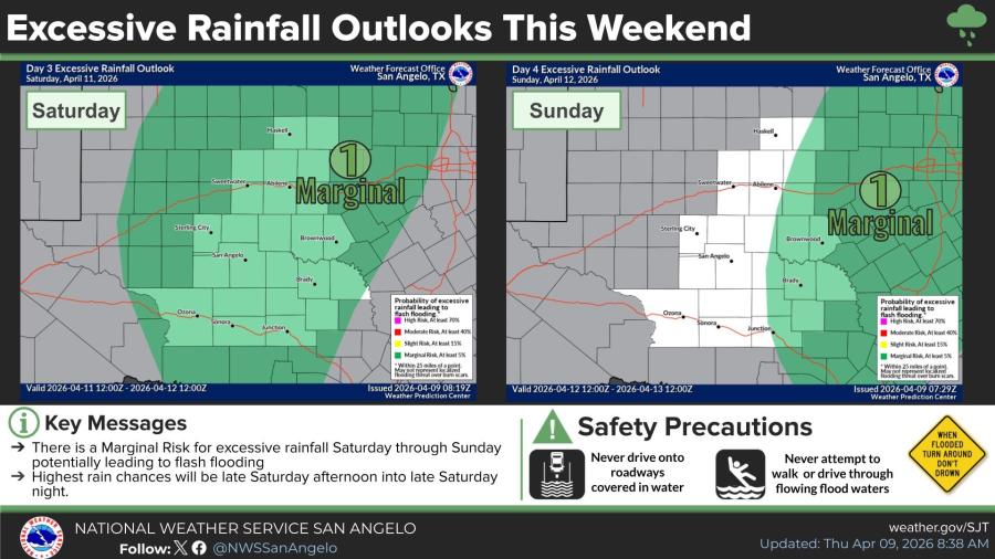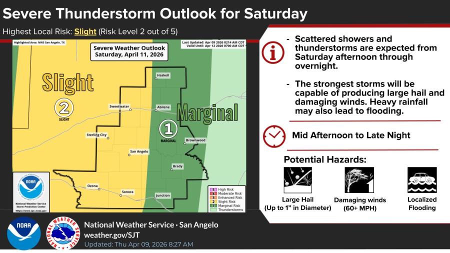 The highest risk is a Slight risk (level 2 of 5) for severe weather across much of the area west of a line from near Sweetwater to Junction, including San Angelo, according to the NWS Storm Prediction Center. Areas east of that line, including Abilene and Brownwood, are under a Marginal risk. Storms are expected to form Saturday afternoon and continue through overnight hours, with the strongest activity from mid-afternoon into late night.