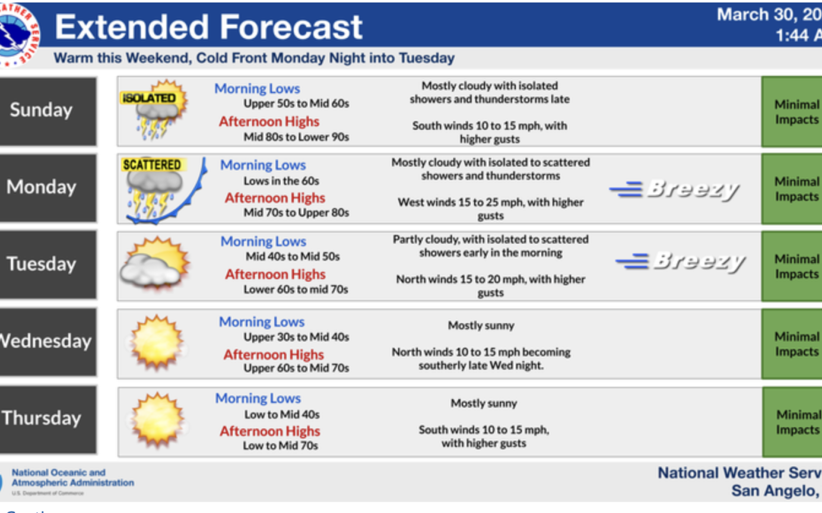 SAN ANGELO, TX — Some areas of the Lone Star State are likely to experience highs of 100 degrees during the Easter weekend.
