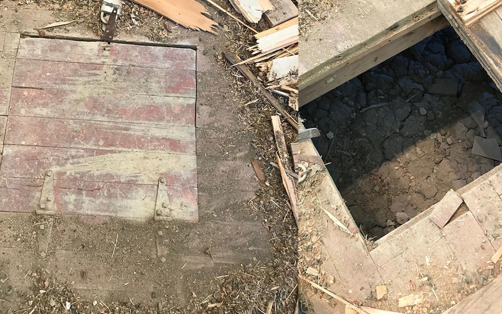 Termites destroyed wooden floor of church and was removed, revealing an older floor in altar area. Also revealed, a locked trap door (closed on the left; opened on the right) not opened in 75 years! Did it hide the famous “lost silver mine” of Menardville legend? Or hidden treasure? When opened, it revealed … dirt and crumbling concrete.
